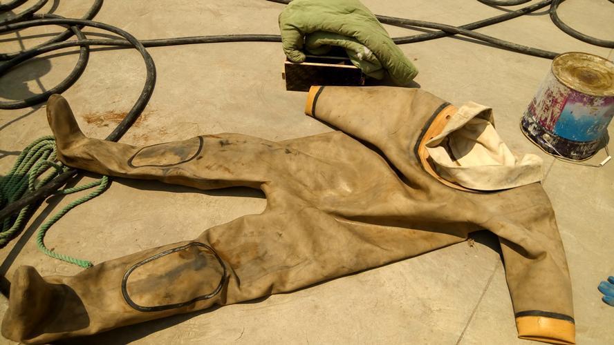 头顶烈日,只见姜桂章捡起一只空的油漆桶当凳子,毫不犹豫地开始穿棉衣。他的脚边,还躺着一件特制的连体潜水衣和一双笨重的铜鞋,等着穿好棉衣的他套上。