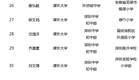 深圳实验学校小学部3人、荔园小学2人、南山外国语学校2人、美莲小学2人、洪湖小学2人、翠竹小学2人、福民小学1人、梅园小学1人、中英公学1人、清华实验学校1人、南山实验学校1人、水库小学1人、景秀小学1人、南岭小学1人、南山中英文学校1人、红桂小学1人、北京大学附属小学1人、沙河小学1人、宝民小学1人、福田保税区外国语小学1人、深圳南开学校1人、景龙小学1人、安徽省芜湖市镜湖小学1人。