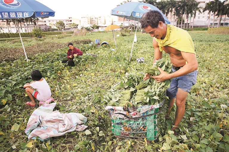 天气十分炎热,陆先生带着家人在菜地里收割红薯叶。