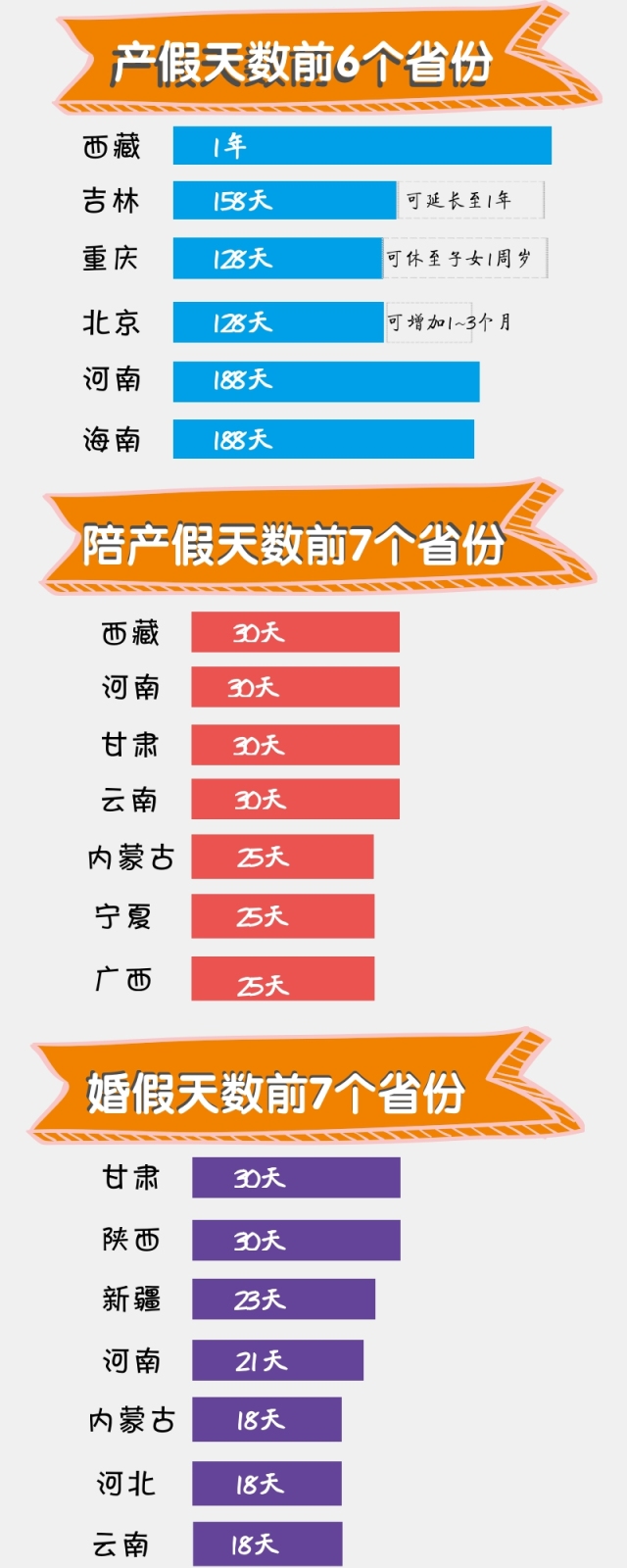河南、黑龙江、陕西,增加了婚检假,参加婚检的夫妻,婚假分别增至28天、25天、13天。