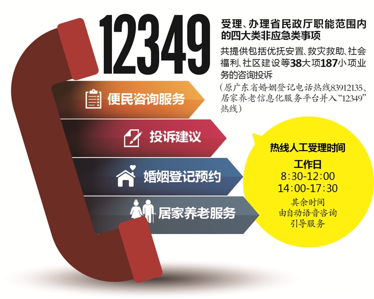 昨天从市民政局获悉,广东省民政厅“12349”民政服务热线已正式上线运行。省民政厅方面表示,将结合实际需求,拓展灾害救助、殡葬管理等业务办理服务事项,并统筹延伸到地市,构建省、市二级运行通信支撑网络,实现“12349”热线省、市两级全覆盖。