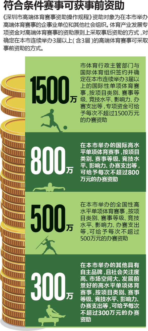 我市近期印发了《深圳市高端体育赛事资助操作规程》《深圳市体育企业贷款贴息资助操作规程》《深圳市高水平职业体育俱乐部资助奖励操作规程》《深圳市体育产业园区和基地奖励操作规程》四项文件,给予资金支持。