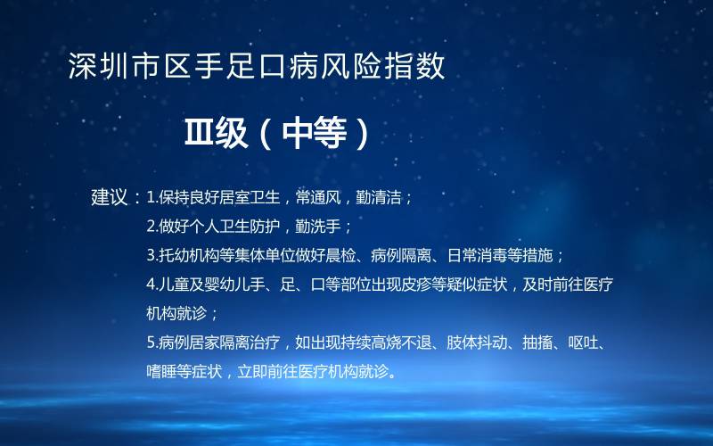 未来一周(9月6日至9月12日),深圳市手足口病风险指数为Ⅲ级(中等),意味着深圳的手足口病活动强度较强,病例数将可能增多。