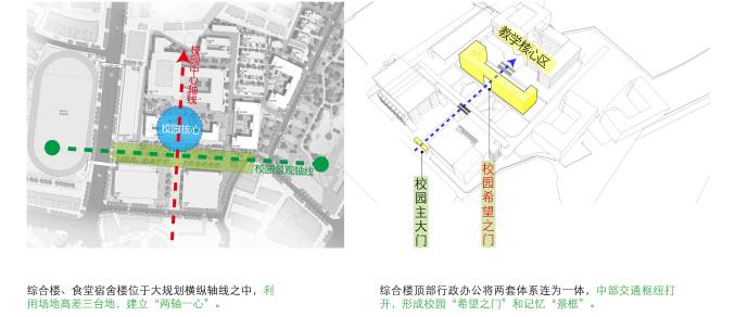 综合楼被中轴线中心贯穿,顶部行政办公将两套体系连为一体,中部交通枢纽打开,形成校园“希望之门”和记忆“景框”,顺应校园主轴的发展脉络,追忆过往的熟悉画面。