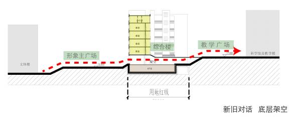 通过顺应基地景观轴,不同标高场景切换,综合楼西面首层架空,满足学生课外活动,更好地与生活区联系;