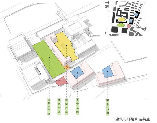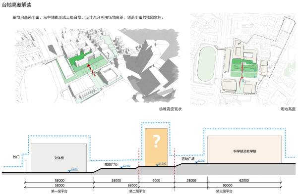 同时利用场地高差三台地,建立“两轴一心”。沿中轴线走进校园,到达教学核心区。