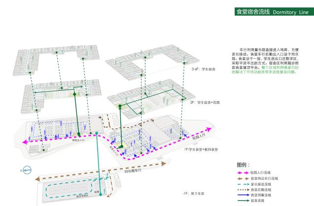 食堂置于半地下层,与学生宿舍隔层分隔开来,保证宿舍的私密和安静,同时食堂后勤出入口设于童乐路,两侧设置后勤物流场地,方便食堂的功能使用。基地东侧利用场地2.2M高差,设置半地下车库和垂直电梯,方便家长接送。