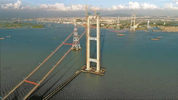 虎门二桥是“粤港澳大湾区”国家战略重要组成部分,建成后全长近13公里,有两座超千米的世界级跨江特大桥,其中坭洲水道桥以1688米跨径位列钢箱梁悬索桥世界第一。2017年6月在先导索跨越珠江施工后,工程建设全面转入上部构造施工工序。