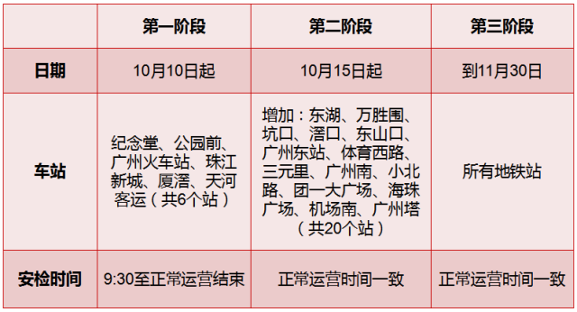 经广州市政府同意,广州地铁将于2017年10月10日起逐步升级安检工作,在所有地铁站按照“人走安检门、物过安检机”的原则实施安检。