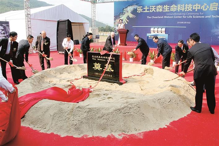 3月16日上午,乐土沃森生命科技中心启动仪式在大鹏新区深圳国际生物谷坝光核心启动区举行。深圳市副市长艾学峰,诺贝尔奖获得者、深圳市科技专家委员会高级顾问、“DNA之父”詹姆斯·沃森教授,深圳市大鹏新区党工委书记王京东,党工委副书记、管委会主任李勇,国家科技成果转化引导基金理事长、南方科技大学乐土精准医学研究院理事长马蔚华,乐土投资集团董事长刘如银等出席仪式,并为项目奠基。