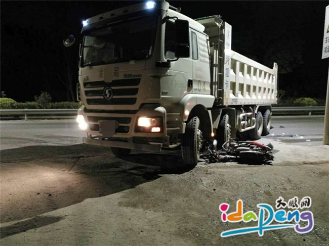 事故导致摩托车侧翻、泥头车部分受损坏,现场可见明显血迹