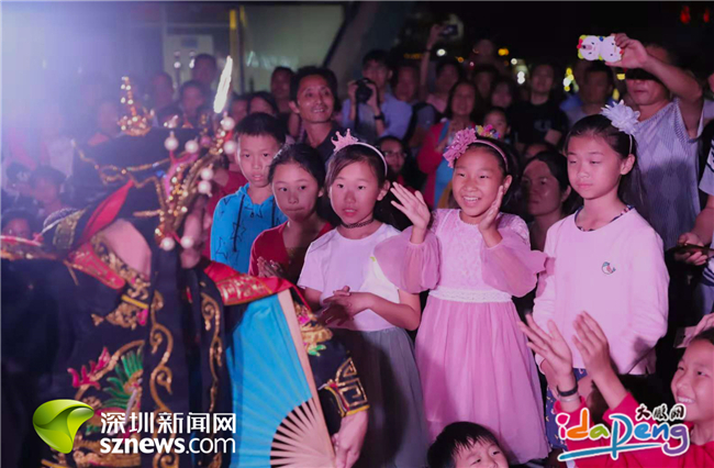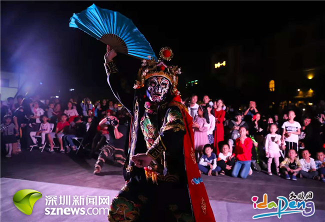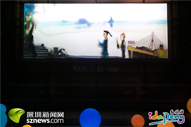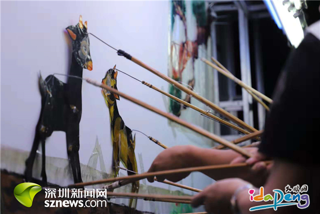 大鹏新区非遗文化促进会会长蔡劲笋率团队成员向观众献上精彩的皮影戏