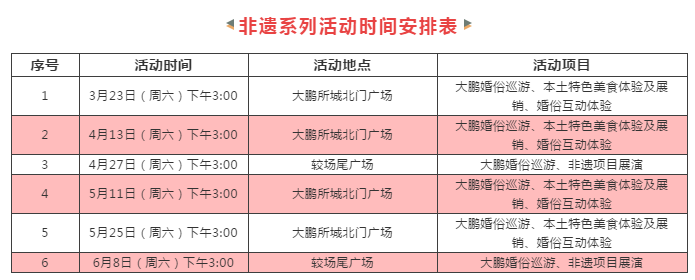 值得一提的是,为了让更多市民游客进一步了解大鹏文化,大鹏所城及较场尾还将计划上演一系列“非遗”展演(非遗系列活动时间及地如下图所示)。市民旅客可在赏春的同时尽情体验大鹏的“文化大餐”哦!