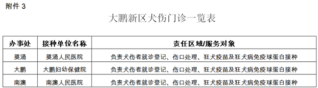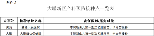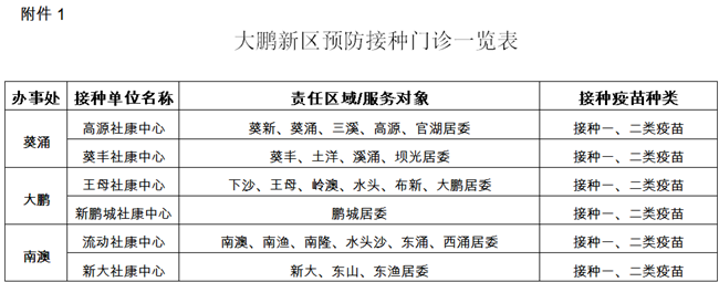 为进一步规范新区预防接种工作,确保预防接种工作安全、规范、有效、便民,根据《疫苗流通和预防接种管理条例》规定,结合新区人口和医疗机构分布状况,经研究,决定调整大鹏新区指定预防接种单位及其责任区域/服务对象(详见附件1-3)。