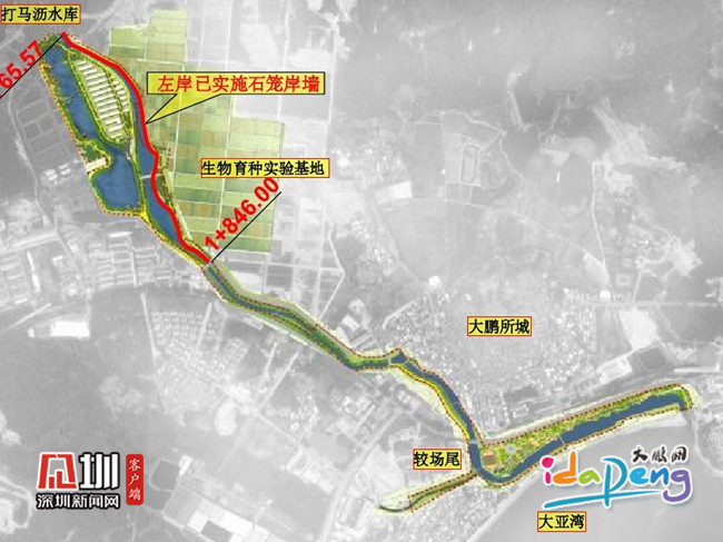 据悉,工程完工后将一改鹏城河水体不达标、杂草丛生、黑泥淤积的旧貌,打造成从下游入海口至上游打马沥水库的沿河风光带,为鹏城片区4A旅游景区创建画上亮丽的一笔。