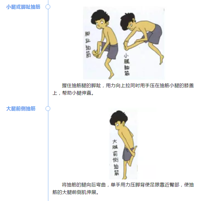 3.在水中突然抽筋又无法靠岸时,应马上停止游泳,并根据抽筋部位松解痉挛,同时立即呼救,等待救援。