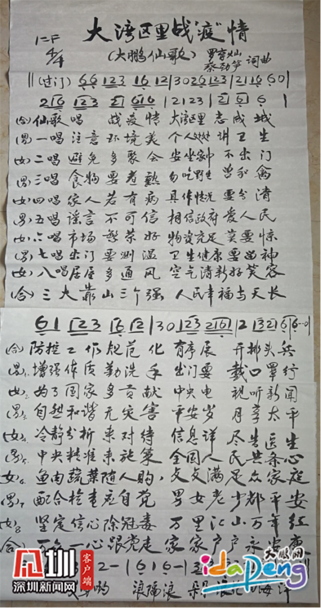 在创作诗词的同时,罗育灿还创作了大鹏山歌《大湾区里战疫情》,将大鹏传统文化的传承与防疫宣传相融合,弘扬了在疫情面前,大鹏人民群众万众一心跟党走,众志成城坚决打赢疫情攻坚战的信心和决心。