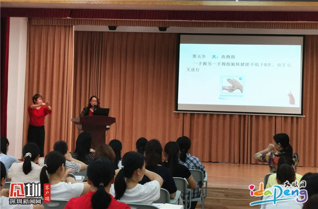 儿保室副主任医师周浪用通俗易懂的语言,图文并茂地讲解了儿童常见传染病的基本知识,包括流感、麻疹、水痘、手足口病、疱疹性咽峡炎等几种常见病的发病症状、传播途径和防控措施,深入浅出地阐释了儿童传染病的预防重点,并特别强调儿童应当勤洗手、多喝水、加强营养、经常锻炼身体、及时接种相关疫苗,以及少去人群集中处等良好卫生习惯对预防传染病的重要作用。最后,护士现场演示了七步洗手法,教师们积极练习互动,气氛轻松活跃。