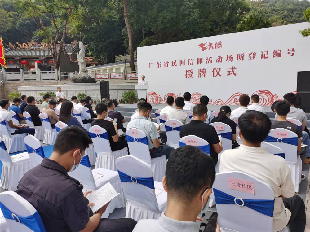 授牌仪式上,省民宗委副主任黄忠幸为观音山龙岩古寺颁发《广东省民间信仰活动场所登记编号证》。这是广东省出台民间信仰活动场所登记编号管理实施办法后,颁出的全省第一个民间信仰活动场所登记编号证书。