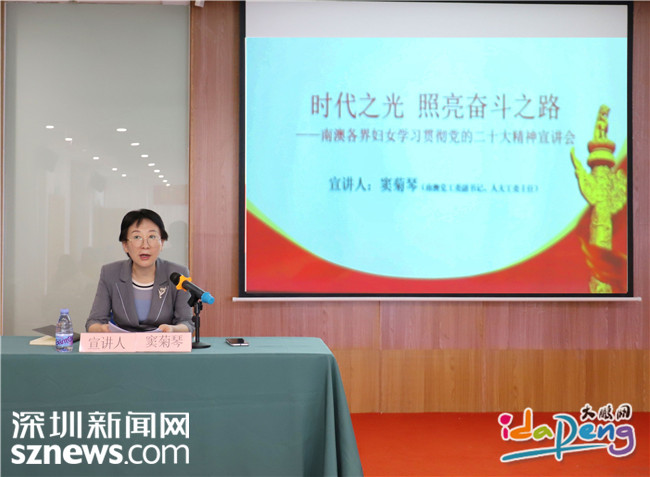 读特客户端·深圳新闻网2023年4月17日讯(记者 谢小蕾 通讯员 张丹)人勤春来早,奋斗正当时。为深入学习宣传贯彻党的二十大精神,日前,大鹏新区南澳妇联组织开展巾帼宣讲活动,来自辖区女职工干部代表、基层妇干、区人大代表、教育、医疗、企业、媒体、社会组织等南澳各界40余名妇女代表齐聚一堂,聆听了南澳党工委副书记、人大工委主任窦菊琴以“时代之光 照亮奋斗之路”为主题作的党的二十大精神宣讲。