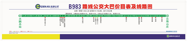 途经站点:大鹏总站、大鹏文体中心、大鹏中心小学、山海苑、岭吓花园、大鹏烈士陵园西、华兴新村、大鹏中心①、岭澳新村、观音山、国家基因库、金沙湾、油草棚、山海湾、大澳湾、云海山庄。