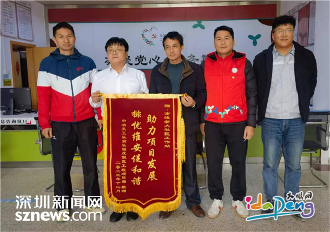 项目部负责人向新大社区赠送锦旗,左一为钟建辉