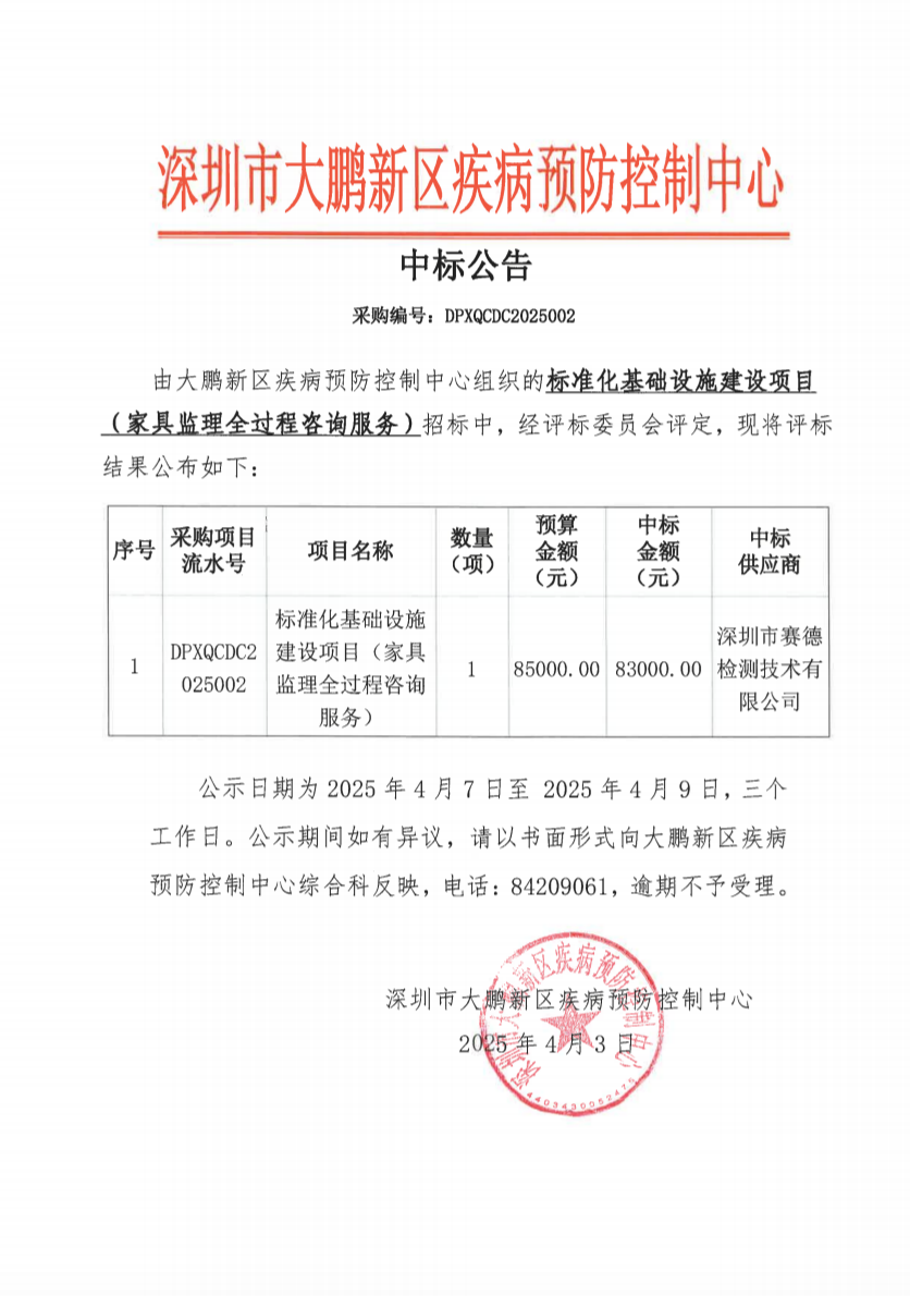 深圳市大鹏新区疾病预防控制中心标准化基础设施建设项目(家具监理全过程咨询服务)中标公告