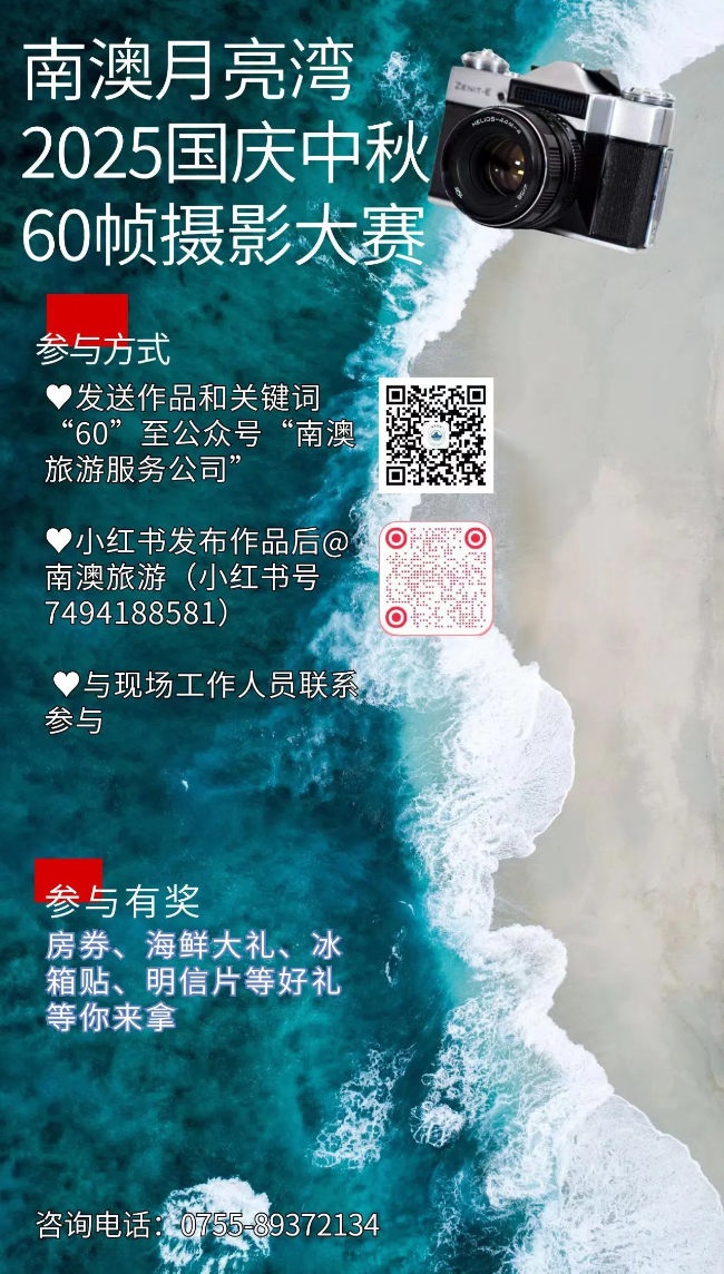 参与方式:(1)发送作品至公众号“南澳旅游服务公司”,并发送关键词“60”;(2)与现场工作人员联系参与;(3)小红书发布作品后@南澳旅游(小红书号7494188581)一旦参与,代表作品已授权给活动主办方,主办方有权做二次加工或展示等。