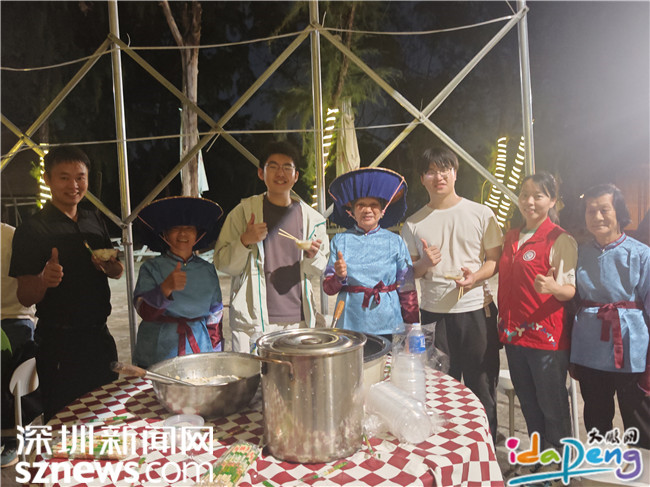 活动尾声,社区特别安排了富有本土特色的人文体验环节,邀请辖区资深阿姨们身着传统服饰,现场展示大鹏特色美食“濑粉仔”的制作技艺。阿姨们一边娴熟地烹饪,一边为北大学子讲述东涌饮食文化与民俗故事,让高校青年在舌尖滋味中读懂东涌的温度与传承。“东涌不仅山美水美,美食更迷人,濑粉仔我一连吃了四碗都不过瘾!”北京大学国际法学院的陈同学意犹未尽地说,“这是一个充满活力与温情的社区,我一定要把这张靓丽的滨海生态名片分享给更多人!”