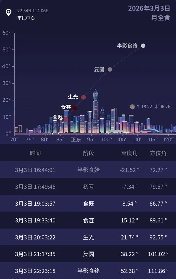 2026年月全食发生时间十分友好,一是恰逢农历正月十五元宵节,二是全食红月亮阶段正好是月亮升起来不久,既不耽误大家休息,也方便大家构图拍摄,万家团聚时邂逅 “红月亮”,双喜临门堪称年度最具文化意义的天象。全食阶段持续58 分钟,月亮将呈现迷人的铜红色,观赏与拍摄价值翻倍。观测时间(深圳地区)为月出:18时22分(东南方升起);食既:19时03分(月亮完全进入地球本影);食甚:19时33分(最大食分1.16,红月亮最明显);生光:20时03分(月亮开始走出本影);复圆:21时17分(月全食结束)。