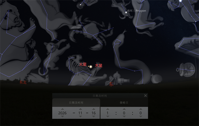 11月16日凌晨,苍穹将迎来年度最值得期待的“行星之约”——火星与木星将在狮子座天区上演一场触手可及的亲密相会。两颗行星仅相隔约1°12′,这距离不到三指并拢的宽度,在夜空中宛若一对相依的明珠,木星以璨若金钻的-2.1等光辉统领天幕,而火星则以0.7等的温润红光静静相伴,一明一暗、一金一红,恰似夜空中的对视。