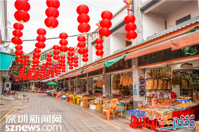 据悉,南澳海味街历史悠久,是珠三角知名的海产干货集散地以及深圳市“放心消费承诺街区”,每年的海味街年货节吸引大批粤港澳游客慕名而至。今年,大鹏新区南澳办事处结合春节主题升级打造南澳海味街,让这条承载老南澳记忆的老街,更具烟火气与山海特色。走进焕新后的南澳海味街,全新特色门头牌格外吸睛——既美观大方,又鲜明彰显“南澳海味”品牌形象,大幅提升老街视觉质感,街巷里挂满红彤彤的灯笼,暖意融融的年味扑面而来,随手一拍都是朋友圈“年味担当”。
