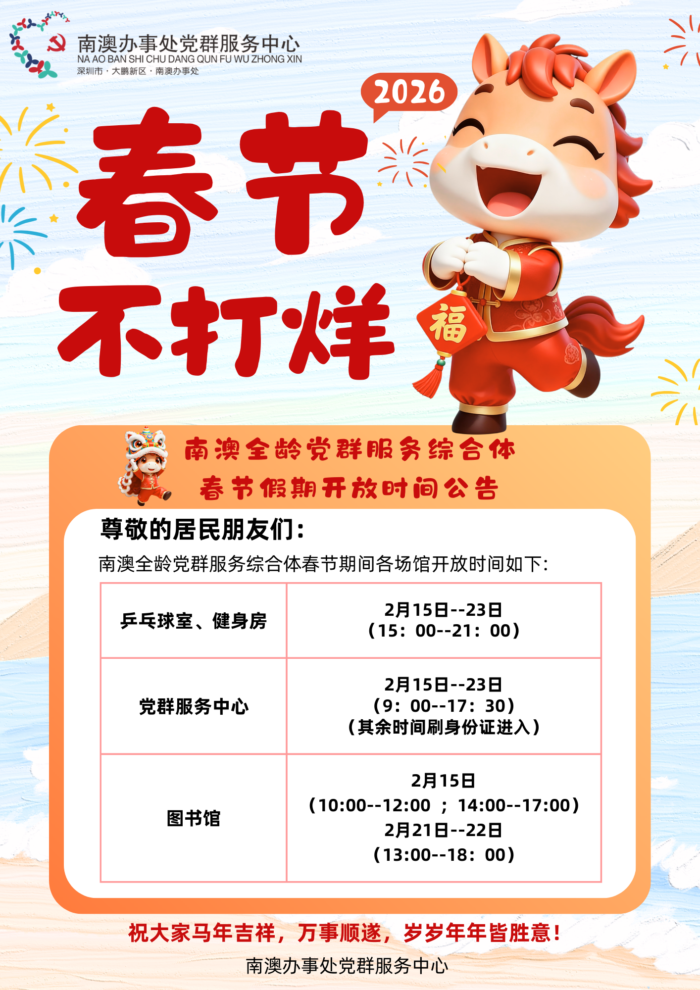 南澳全龄党群服务综合体春节期间各功能室正常开放,开放时间详见海报。无论你是南澳居民,还是远道而来的游客,这里都是你歇脚、暖心的第一站。