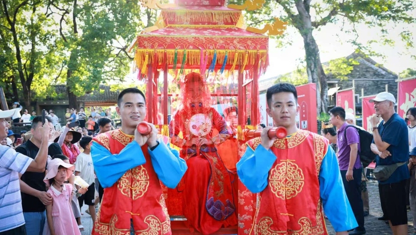 大鹏所城青石巷里,唢呐激昂,红衣簇锦,人声鼎沸。一场穿越时空的婚俗展演在此上演,一对对“新人”重拾浪漫,爱意与古韵共绽芳华。