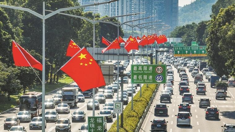 深圳街头飘起“中国红”,整座城市化身一片红色海洋。