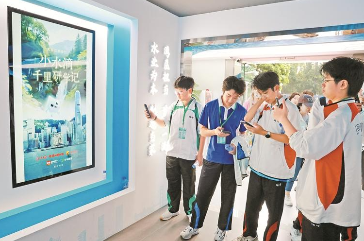 在深圳水库旁的粤海水务展览馆里,讲解员通过融媒创意互动H5作品《从东江到香江——小水滴千里研学记》,向数十位专程来到东深供水工程沿线开展饮水思源活动的香港青少年等一行,生动地讲解着东深供水工程建成60年、东江水供港60年来的故事。