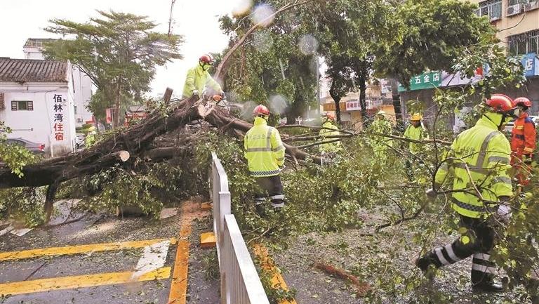 台风“桦加沙”来袭,深圳市多区发生树木倒塌、断枝阻路,深圳消防第一时间前往现场进行处置、消除障碍物。