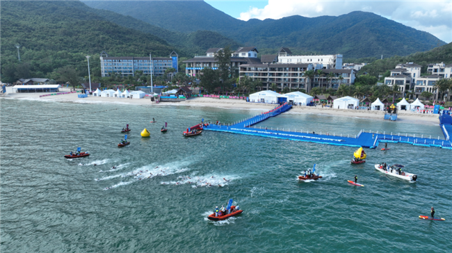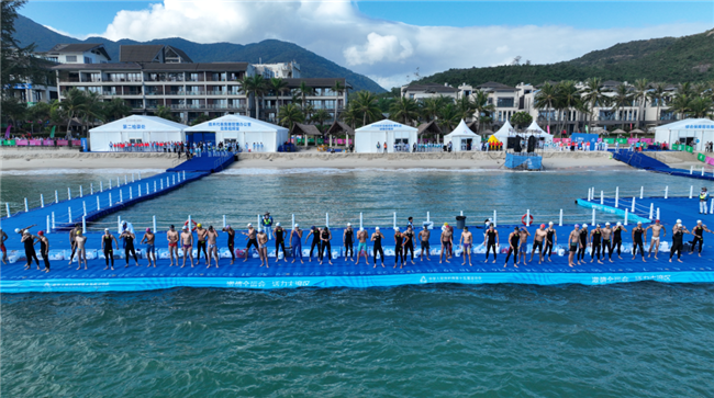 全运会史上首次真实海况下的男子马拉松游泳决赛在深圳大鹏新区桔钓沙海域开赛。