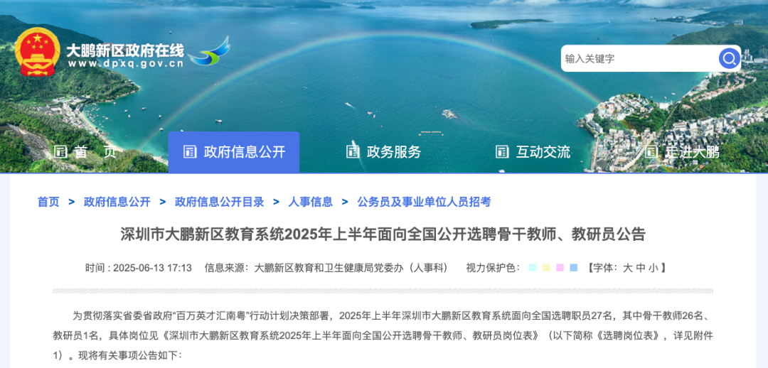 27名,深圳大鹏公开选聘骨干教师、教研员
