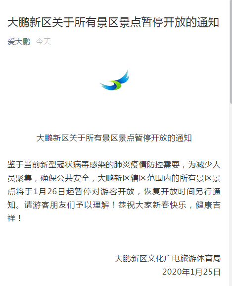 大鹏新区辖区范围内的所有景区景点将于1月26日起暂停对游客开放,恢复开放时间另行通知。