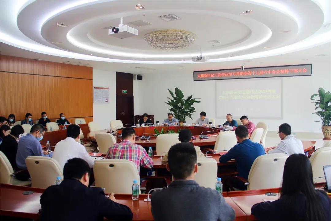 11月17日下午,大鹏新区纪工委召开传达学习贯彻党的十九届六中全会精神干部会议,传达学习贯彻党的十九届六中全会精神及省、市、新区会议精神,研究部署贯彻落实措施。